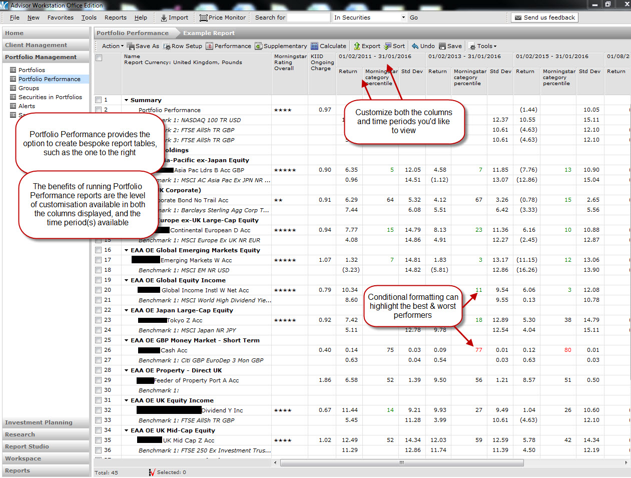 Morningstar Adviser Workstation provides the option to view detailed information for a portfolio in a single click (as detailed in this post). This shows how you can view the current data or data to the last month end, though it’s also possible to view historical data too using Portfolio Performance reporting.