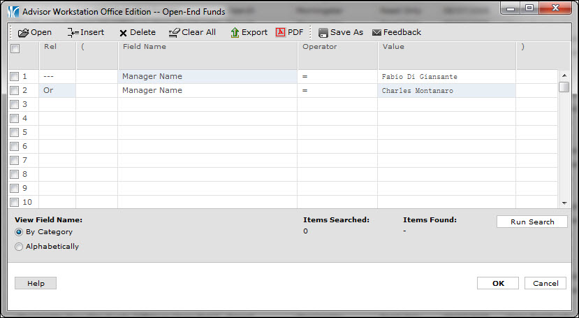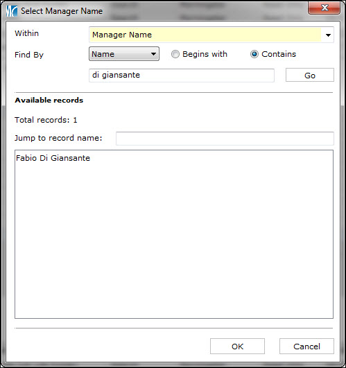 In the first row under Field Name, scroll to find Manager Name, then type in the name and click GO. Once you’ve found the manager, click OK to add the name to the search.