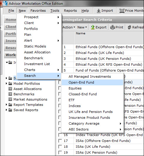 To find the funds in Adviser Workstation, run a search in the Open-End funds universe by going to New>Search>Open-End Fund.