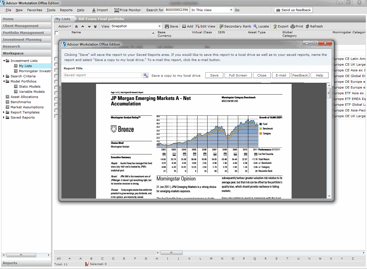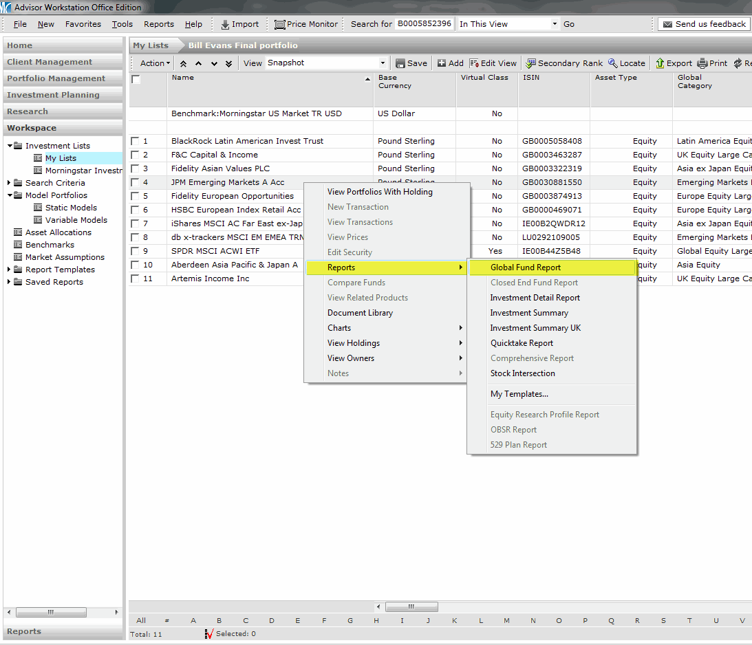 To view a rated fund’s Analyst Rating report, go to an Investment List, Portfolio, Model Portfolio or the Research unvierse:  Right click on the fund’s name and select Reports>Global Fund Report: