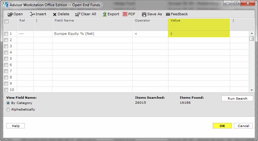 To find the funds in Adviser Workstation, run a search in the Open-End funds universe by going to New>Search>Open-End Fund.