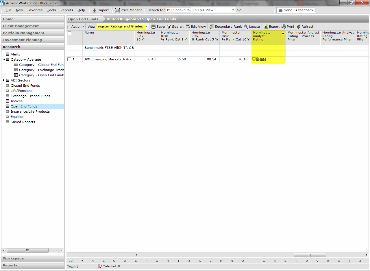 To see if a fund has received a Qualitative Rating, open the fund in an Investment List, Portfolio, Model Portfolio, or in the Research universe. Change the view to: Morningstar Ratings and Grades and scroll to the right to Morningstar Analyst Rating: