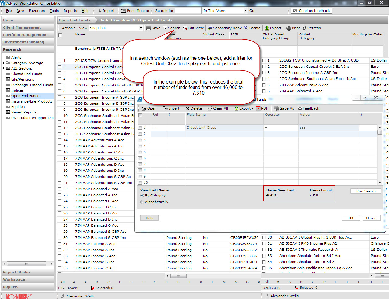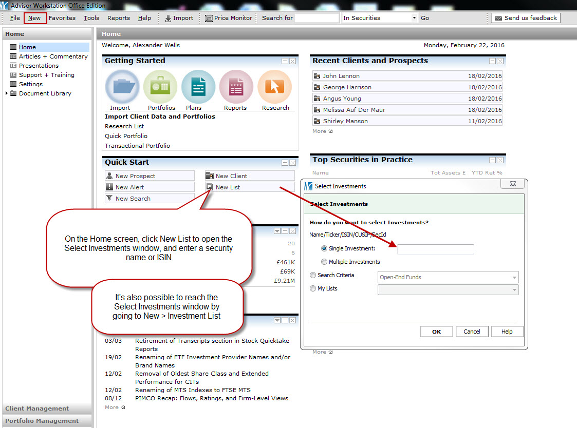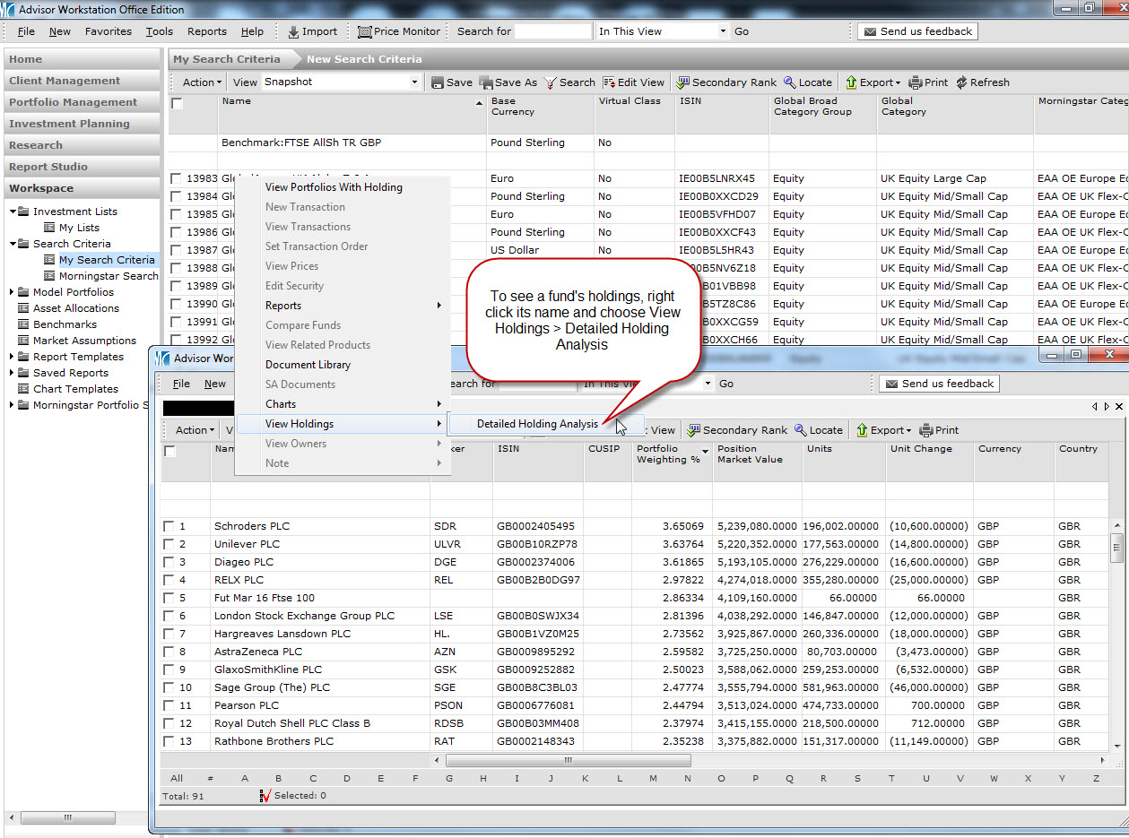 If you have the name or ISIN of a security and need more information on it (e.g. returns, risk measures, asset allocation etc.), it’s possible to search Adviser Workstation with just one click. Click here to find out how