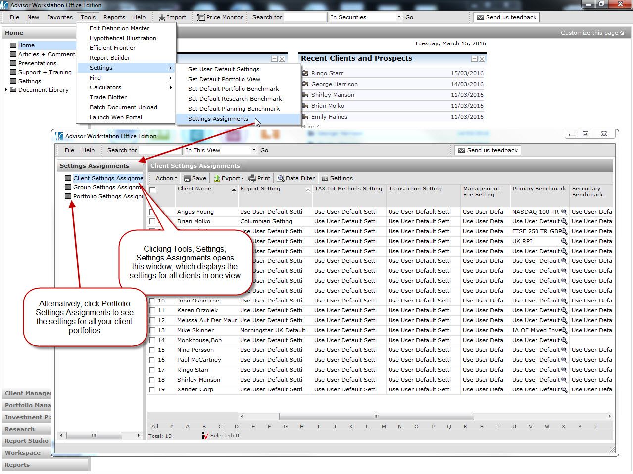 If you’ve ever amended the benchmark for a client account or portfolio in Adviser Workstation, this post is for you. There is a quick way to view (and change) the settings, including benchmarks, for all your clients and portfolios in one handy window. Click here to see how to view all your client/portfolio settings, in just two clicks