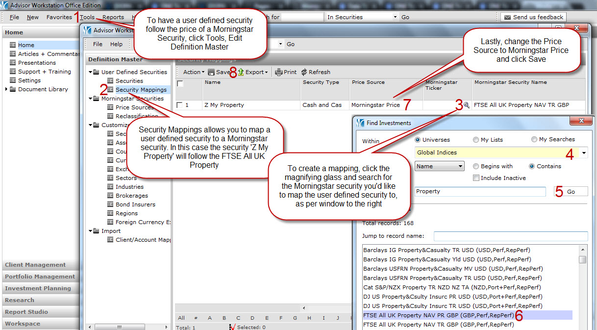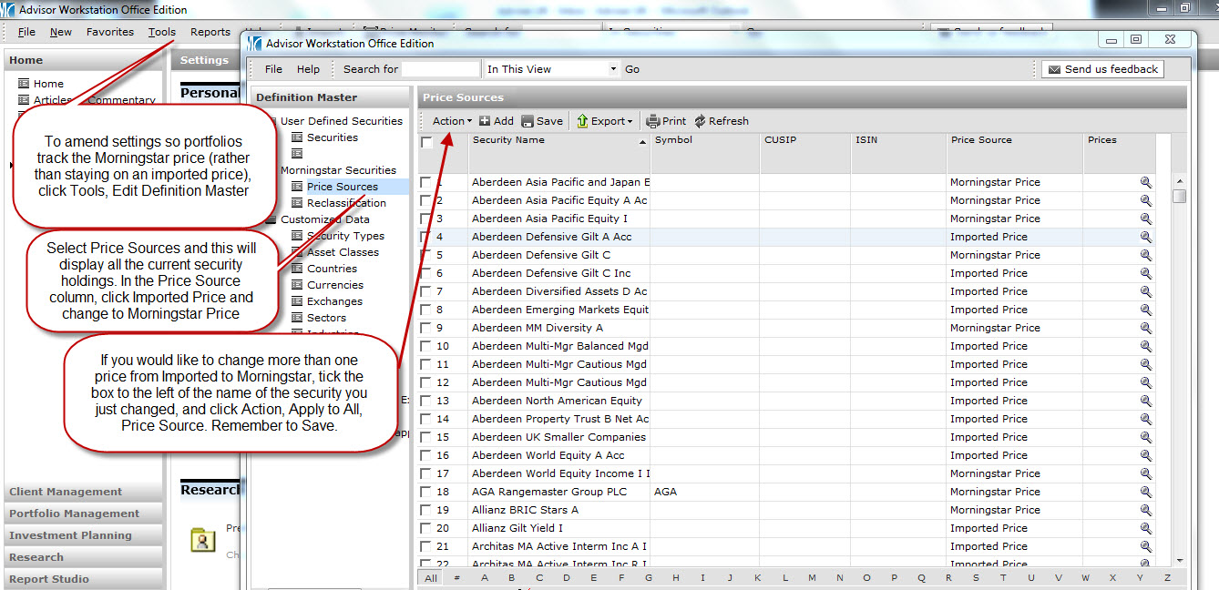 Morningstar Adviser Workstation contains detailed information on thousands of securities including (but not limited to) equities, bonds, open end funds and indices, though it’s possible to include securities of your own creation, as well as additional currencies, asset classes and more, and amend the settings on these as necessary.
